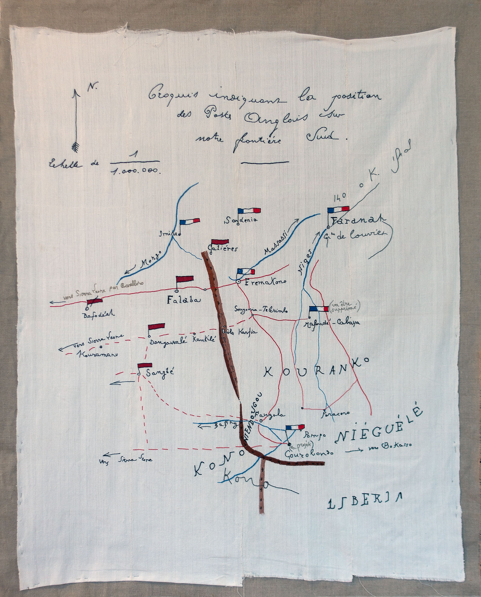 Notes visuelles préparatoires : premières recherches textiles sur le motif et sa copie, inspirées des notes techniques laissées par les Officiers de Marine chargés de ces collectes, des cartes relevées à la main et de la mesure topographique.